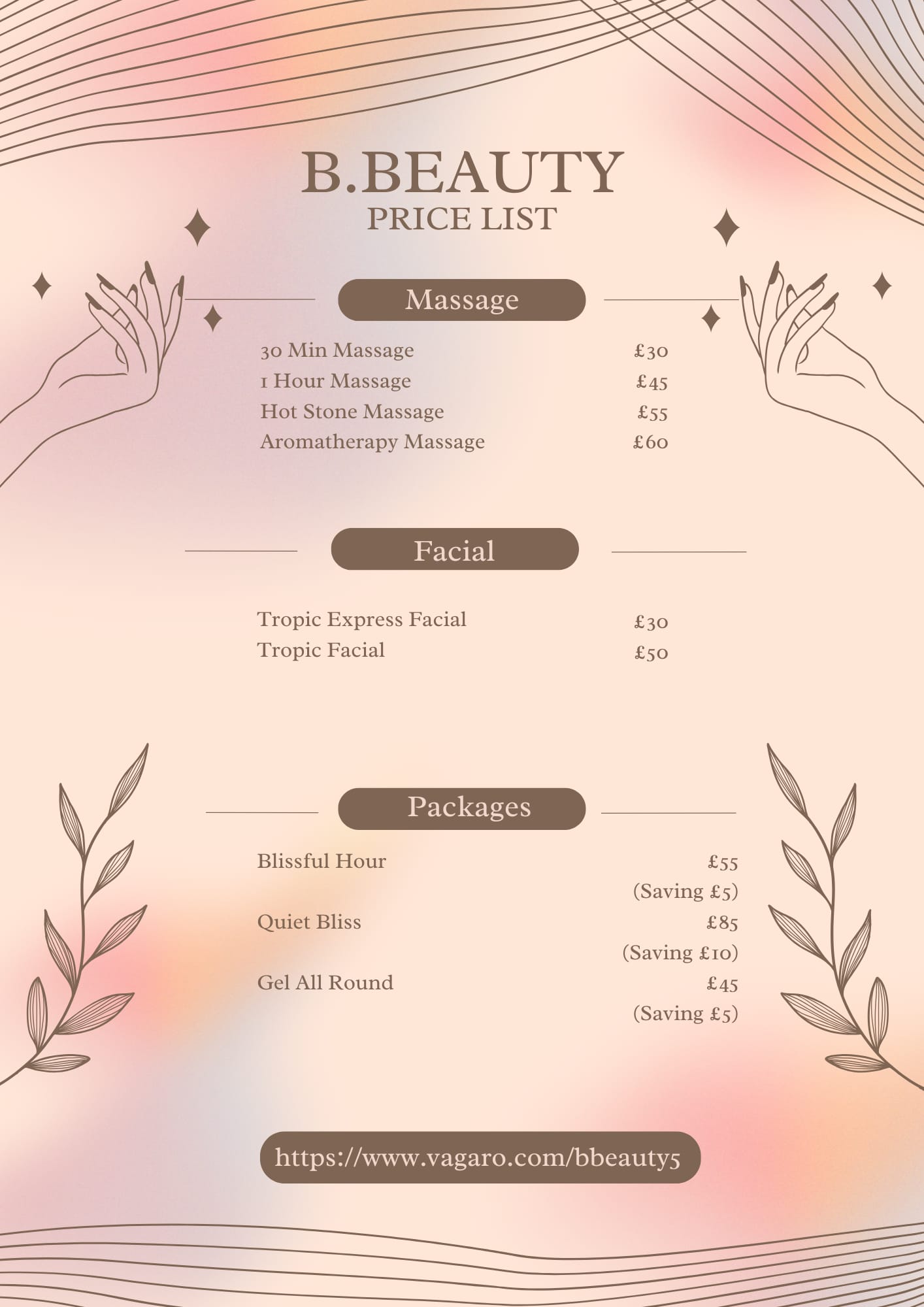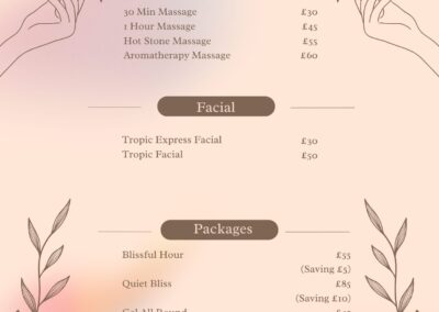 Whether you’re coming in for a soothing Massage, refreshing Tropic Facial, Flawless Biab nails, Gel polish, or a little waxing, I’m here to provide you with a space where you can truly relaxing and recharge.